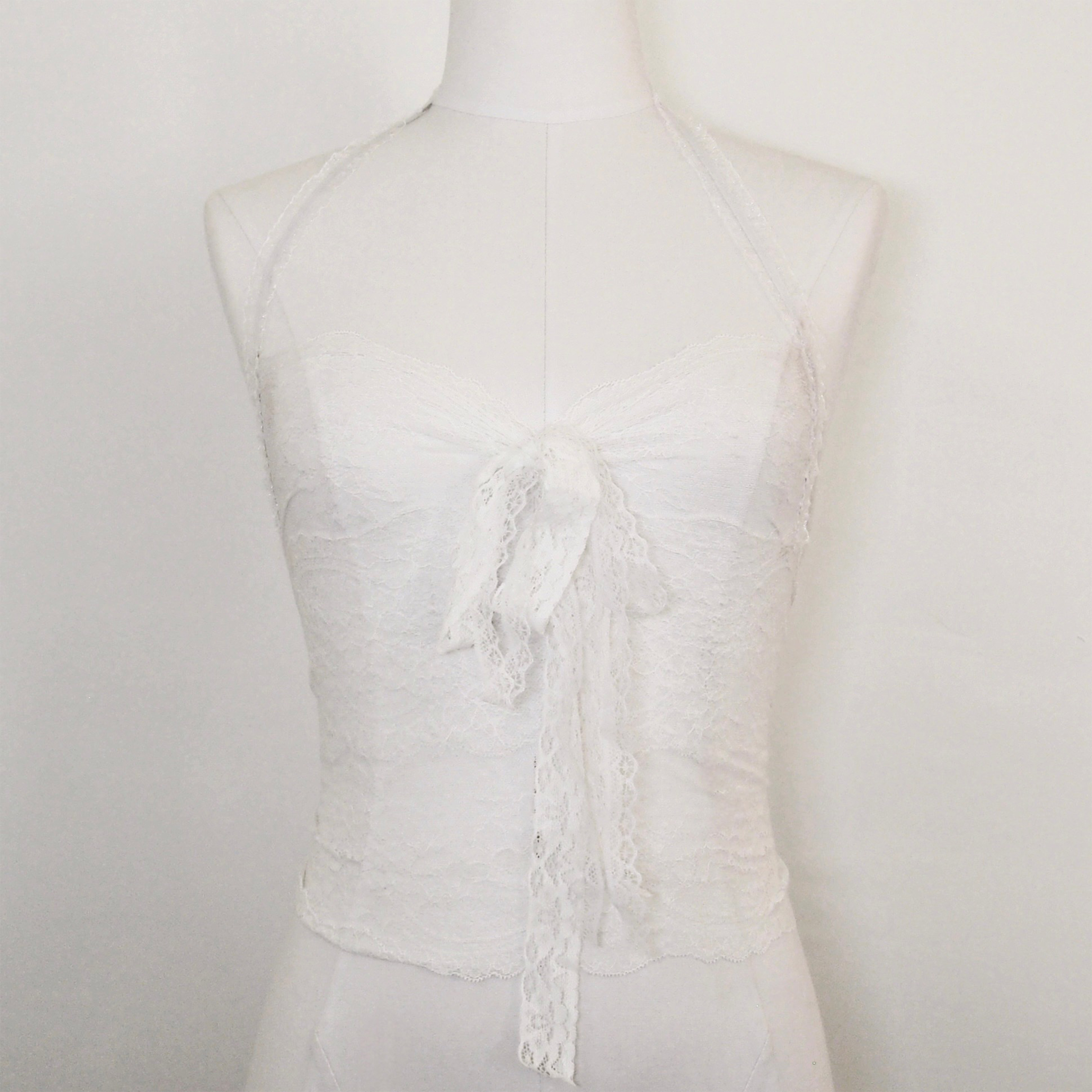 The Antidote Top is a handmade milky white lace top featuring a halter sweetheart neckline and delicate bow detailing.