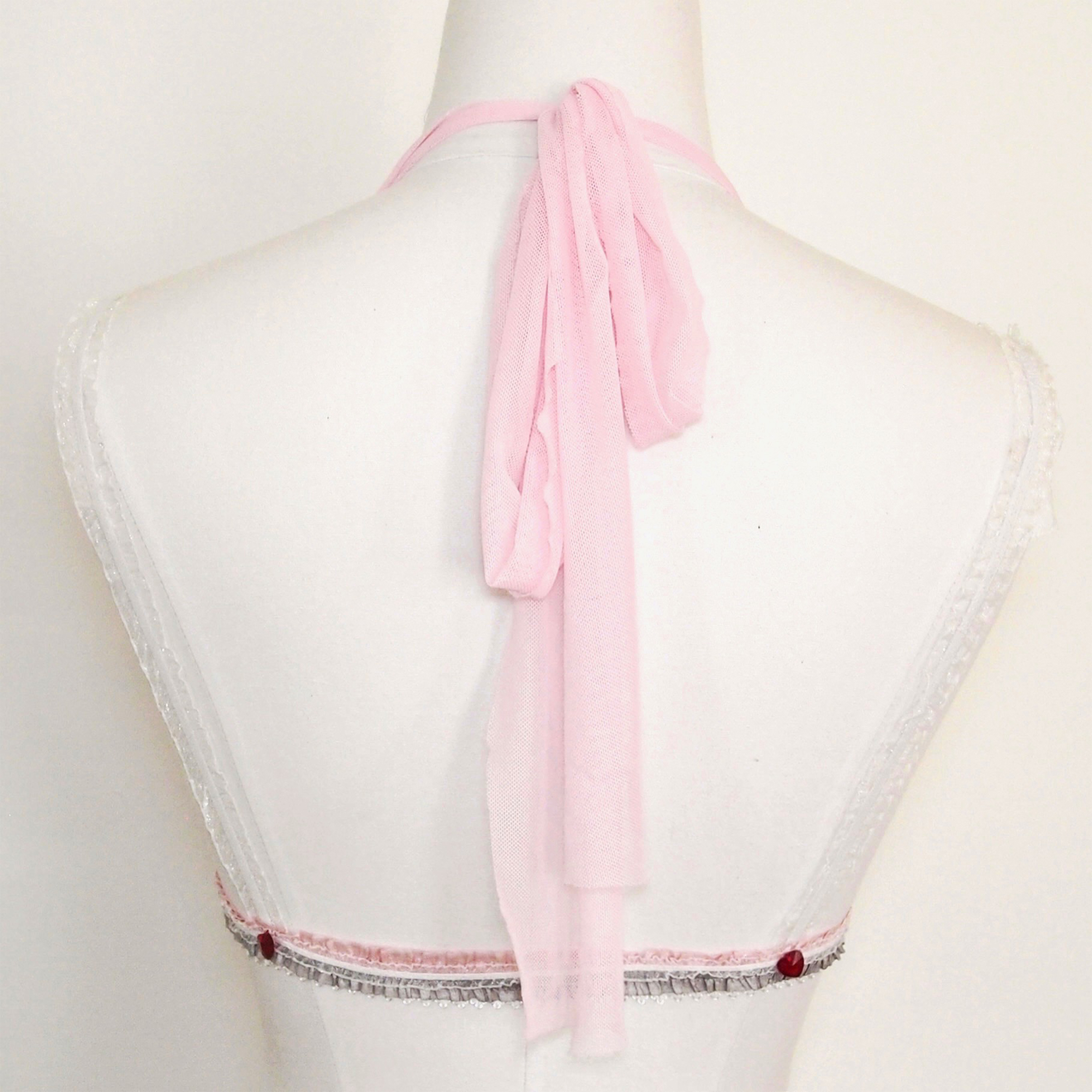 The Scythe Top is a handmade baby pink and beige top featuring a low-cut halter silhouette.