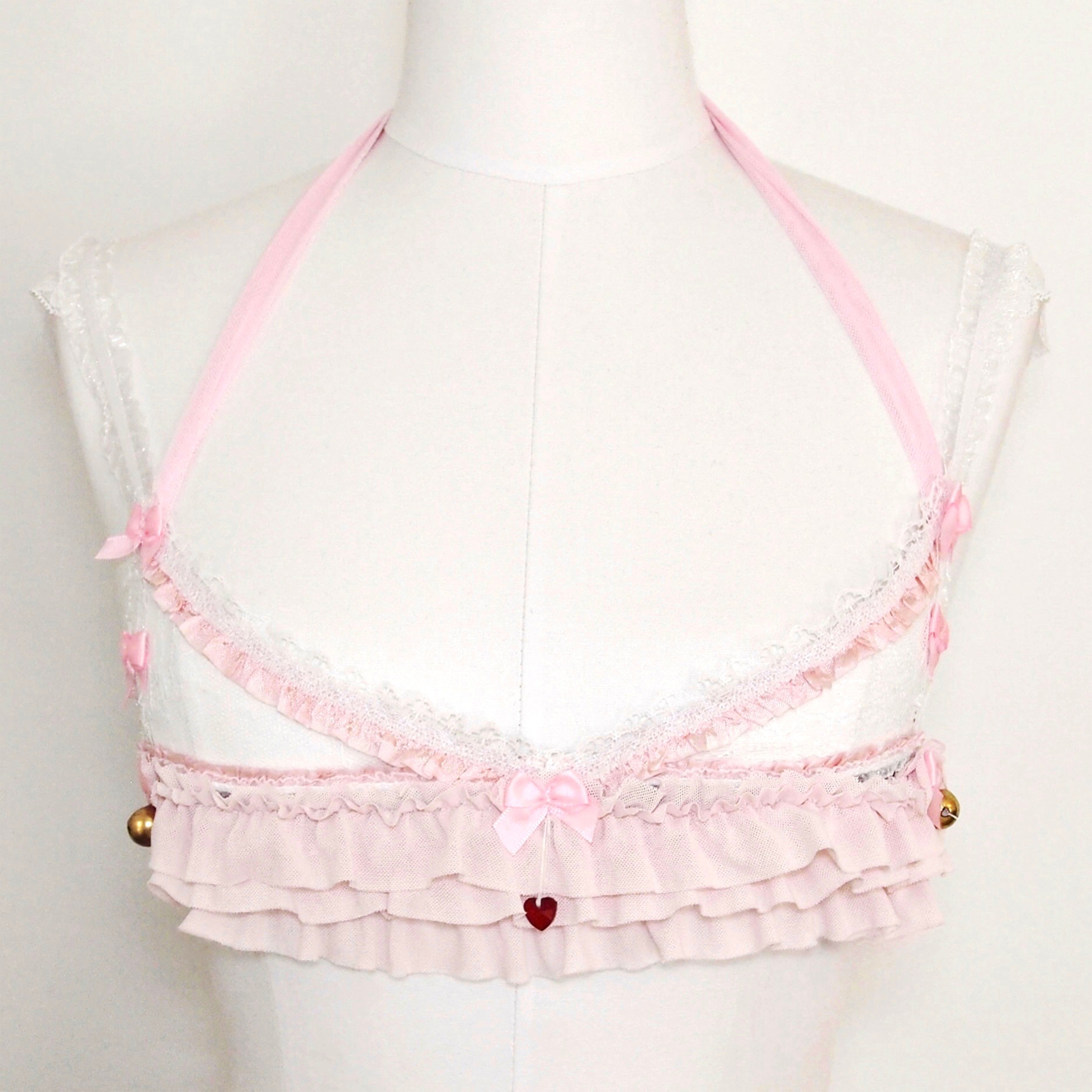 The Blood Gem Bra is a handmade white lace bralette featuring a balconette silhouette, mini satin bows, ruffle trim, cap sleeves, and heart bell detailing, and a blood gem heart charm.
