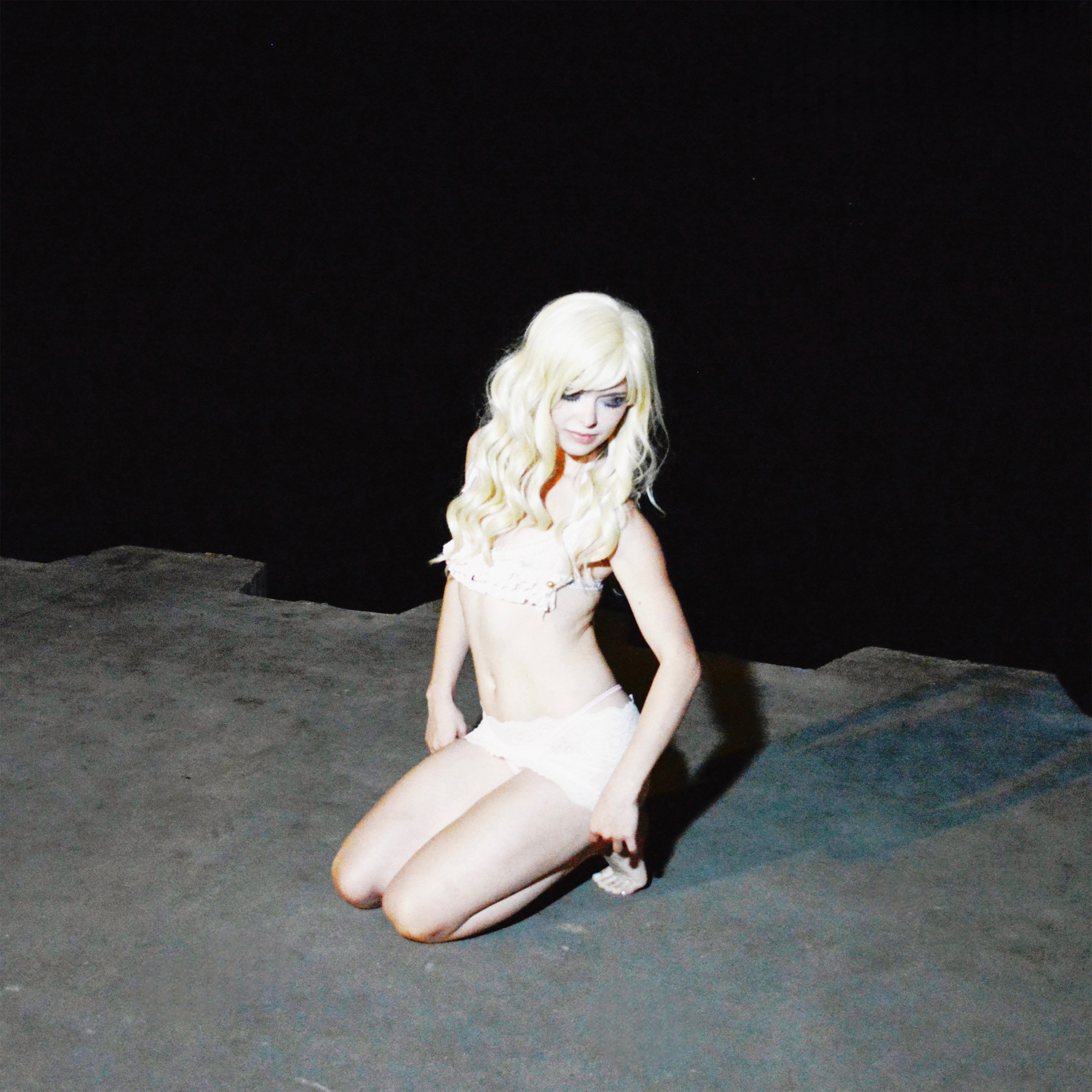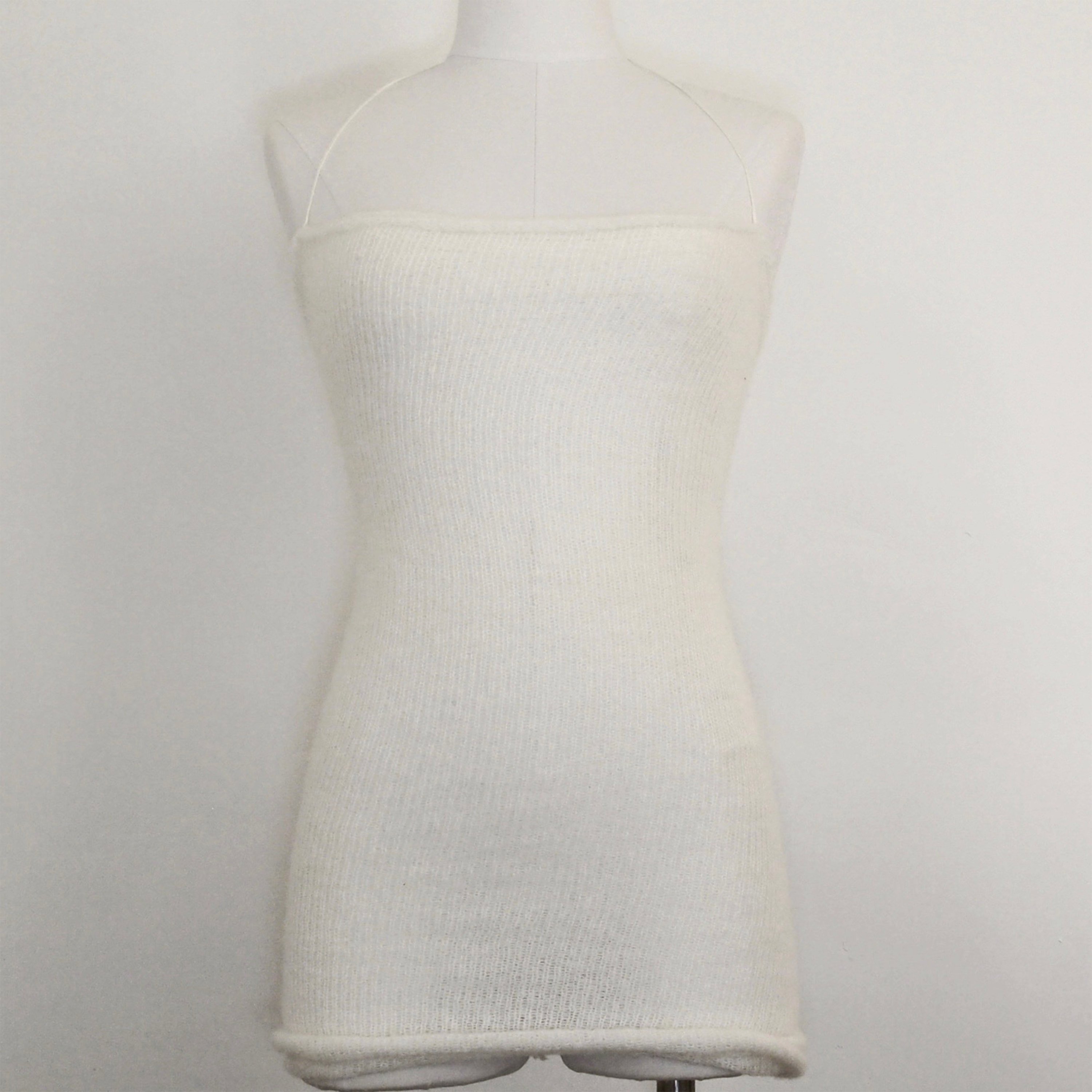 The Curse Chemise is a handmade knit milky ivory strapless micro chemise featuring a raw hem and layered mohair.