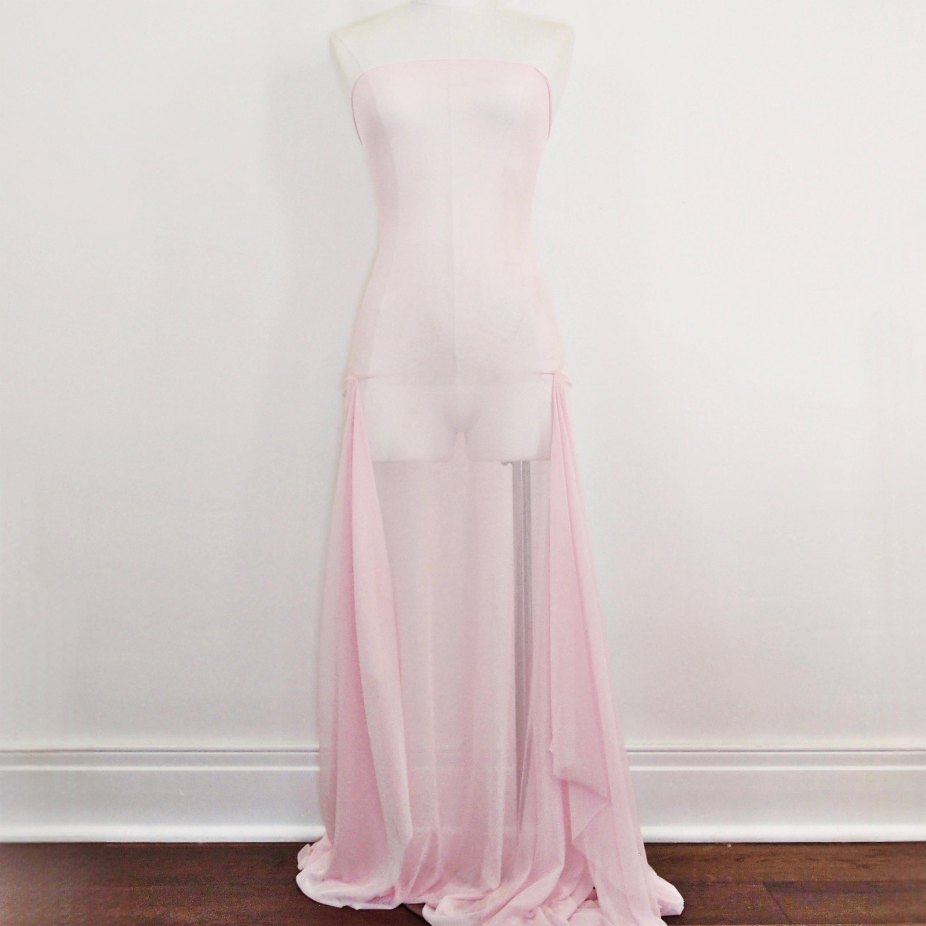The Doll Gown is a handmade sheer baby pink floor-length strapless dress featuring a raw hem and drop waist peek-a-boo low back silhouette.