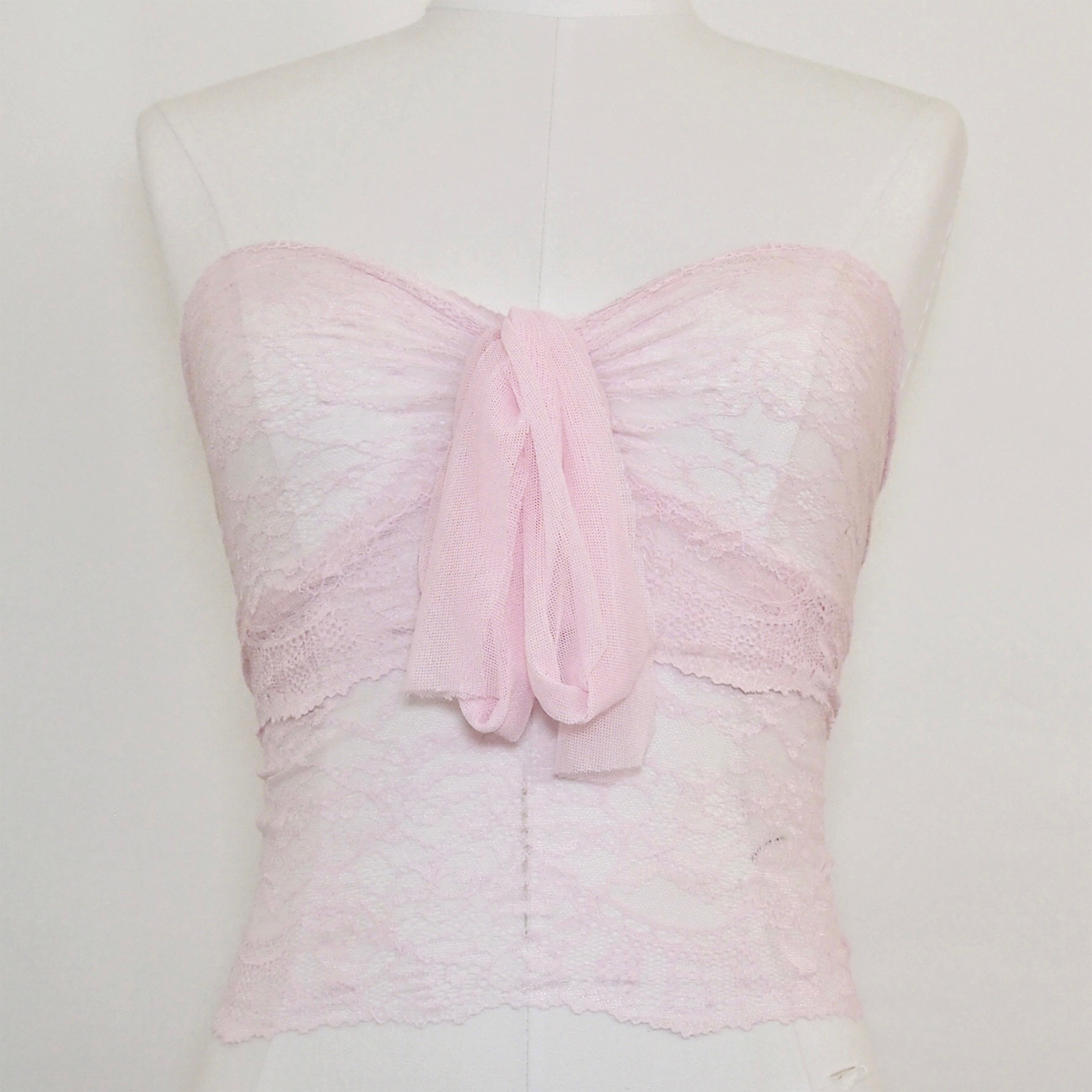 The Keepsake Top is a handmade baby pink lace top featuring a sweetheart neckline and delicate bow detailing.